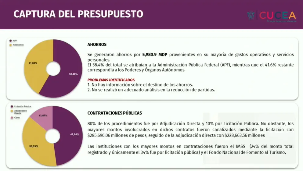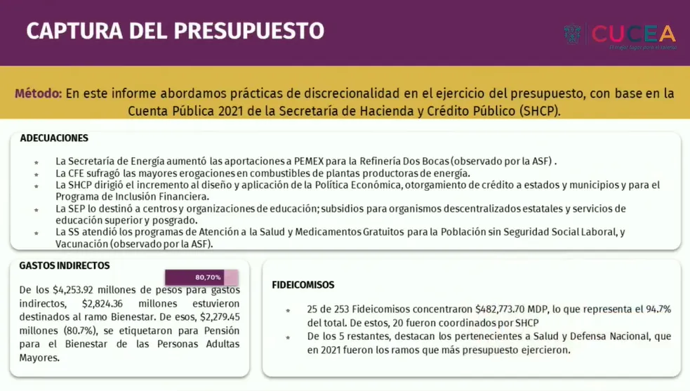 Otro elemento clave del Informe fue el análisis de la captura del presupuesto, donde se identificaron que se aumentaron aportaciones para Pemex, que de los gastos indirectos, 2 mil 800 millones se dirigieron al programa del Bienestar y el 80% para las pensiones de adultos mayores.