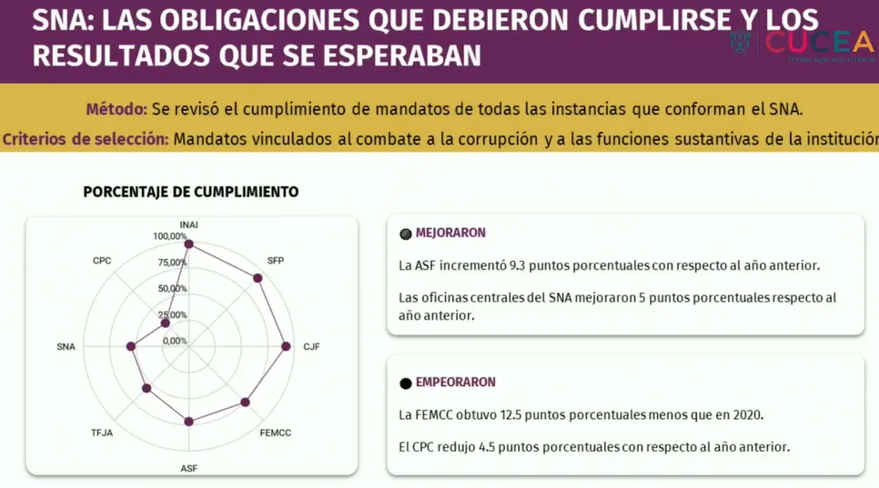 En cuanto a resultados negativos, la Fiscalía Especializada en Materia del Combate a la Corrupción obtuvo 12.5 puntos menos que en 2020 y el CPC 4.5 puntos.