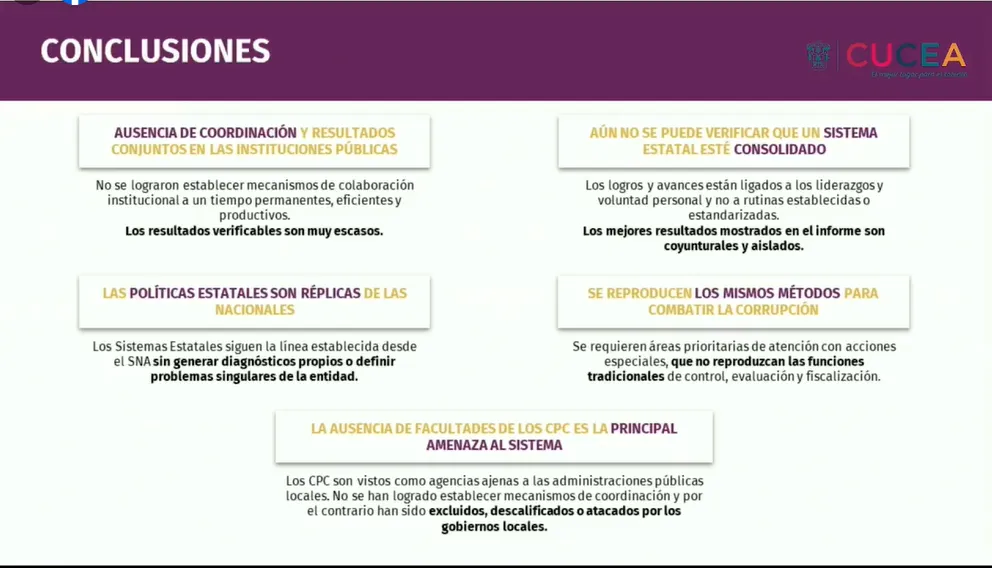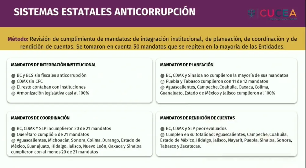 Una novedad en los informes fue el análisis de las obligaciones de los Sistemas Estatales Anticorrupción, donde se puede concluir que hay comportamientos heterogéneos, estados con Sistemas sólidos, estados con Sistemas débiles e incompletos y estados en la medianía, lo que es natural en un sistema federal, pero en algunos casos preocupante.