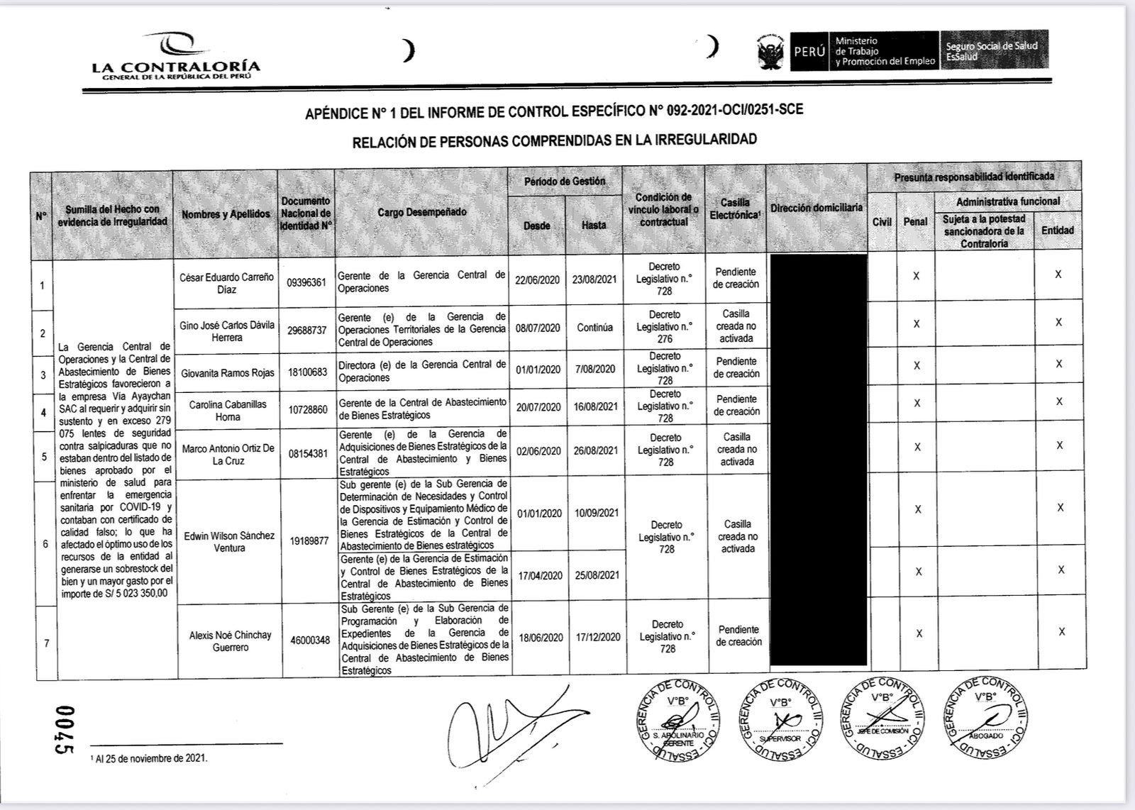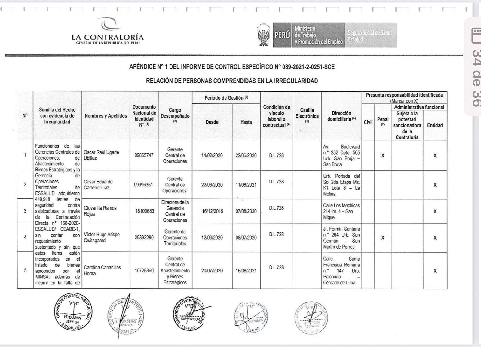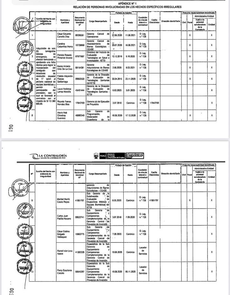 Caso 3: Equipos de tomografía (Informe 107-2021) Sobre la adquisición de tomógrafos de emergencia para el diagnóstico del virus, el Informe de Control Específico Nº 107-2021-2-0251-SCE analizó el periodo entre agosto de 2020 y marzo de 2021. El Apéndice 1 de este documento es, si cabe, más extenso, detallando responsabilidades para catorce funcionarios de diversas gerencias y subgerencias. Mi nombre no figura entre los catorce responsables identificados por el órgano de control.